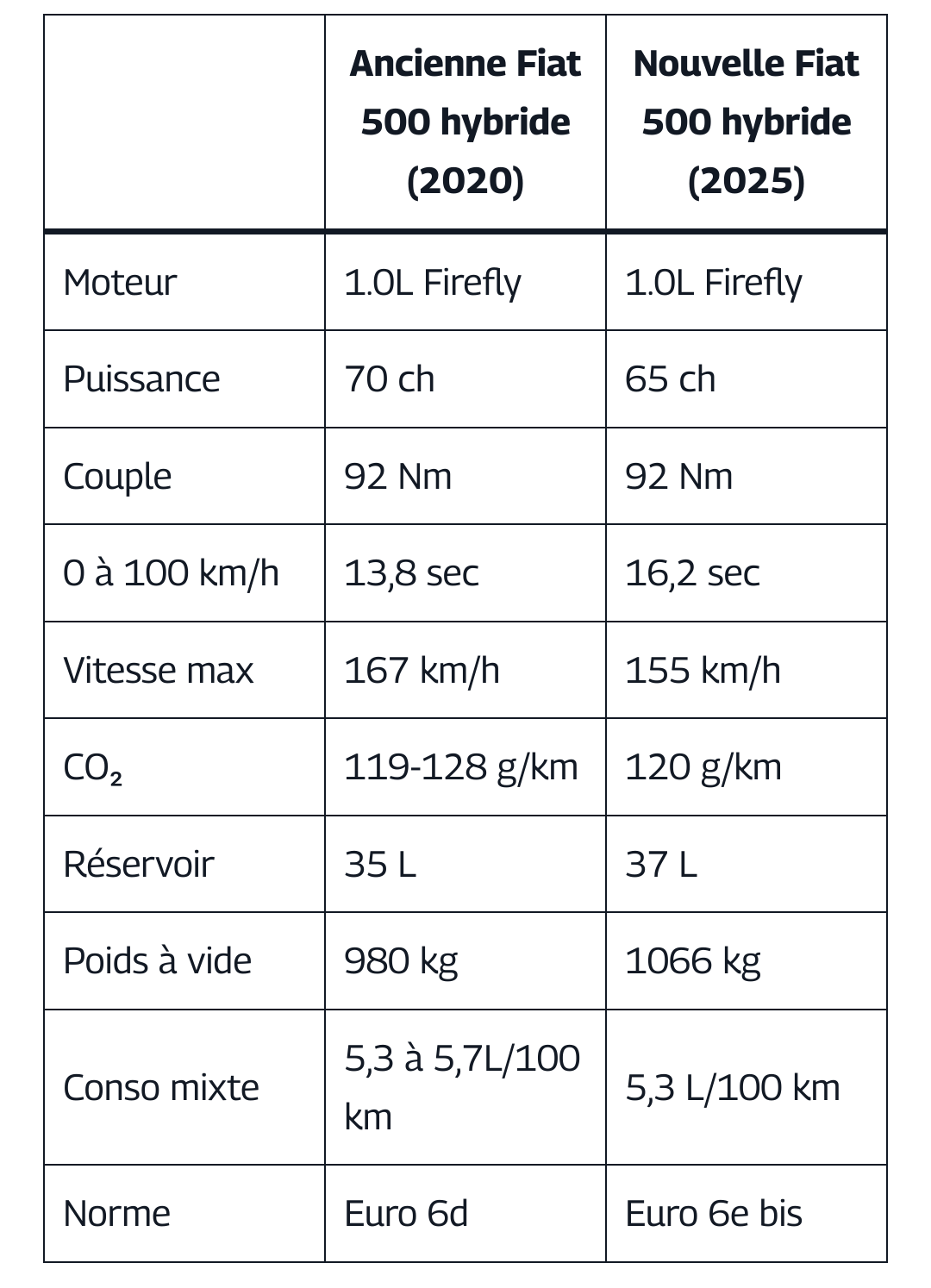 Le plus con c'est que je découvre qu'il y a une version 1.0 100 ch 190 Nm installée dans la Tipo ...127 gr CO2 ....mais elle doit faire 200 kg de plus que la 500 donc au final presque quasi certain qu'il serait à 120 gr CO2 que la version 65 ch .